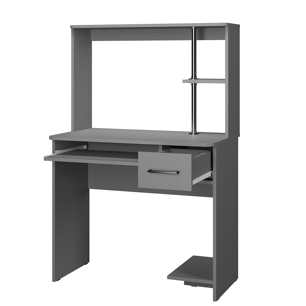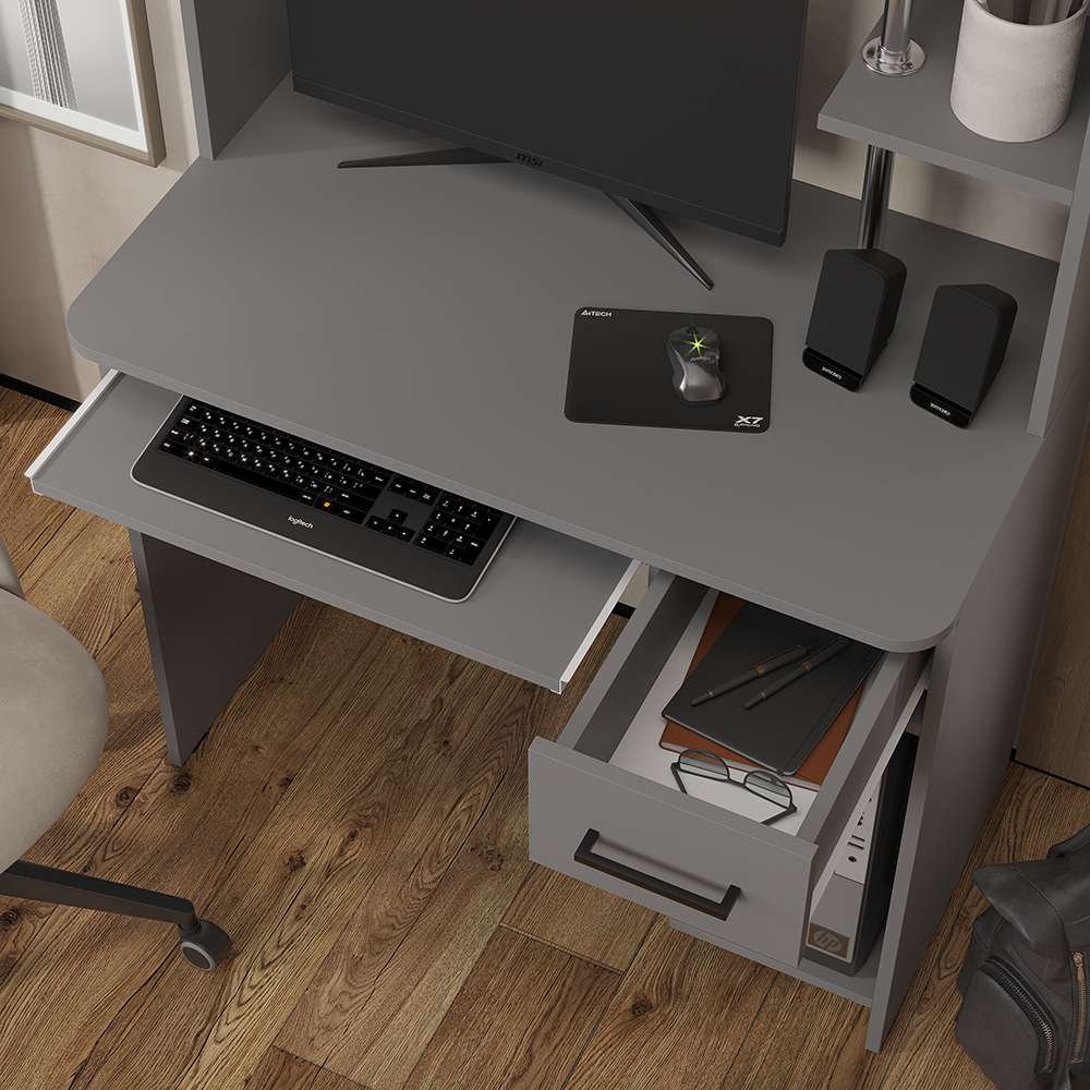 • Организация пространства: Надстройка над столом позволяет разместить аудиосистему, фотографии или декор, освобождая основную зону для работы. Выдвижная панель для клавиатуры обеспечивает эргономичное положение рук.