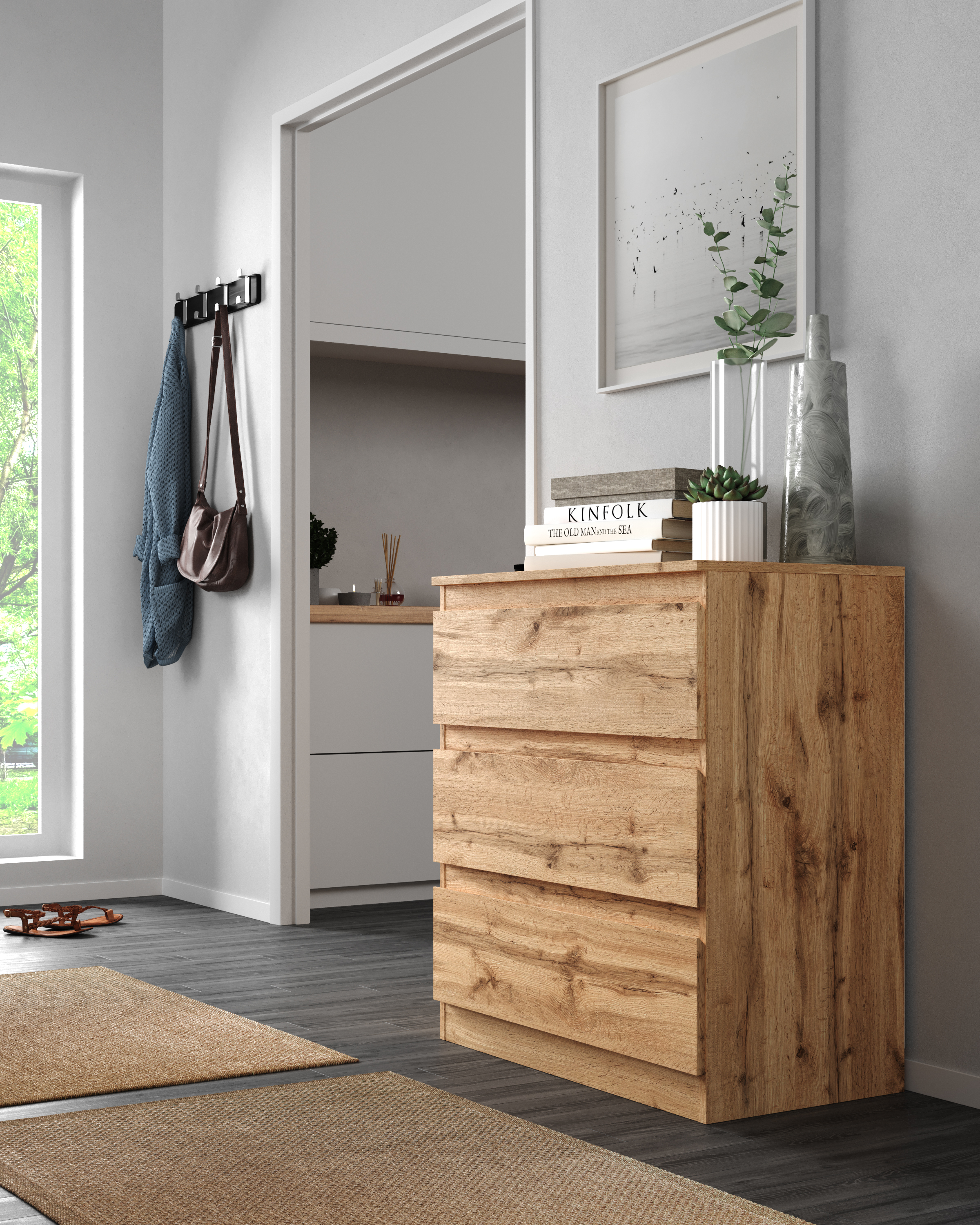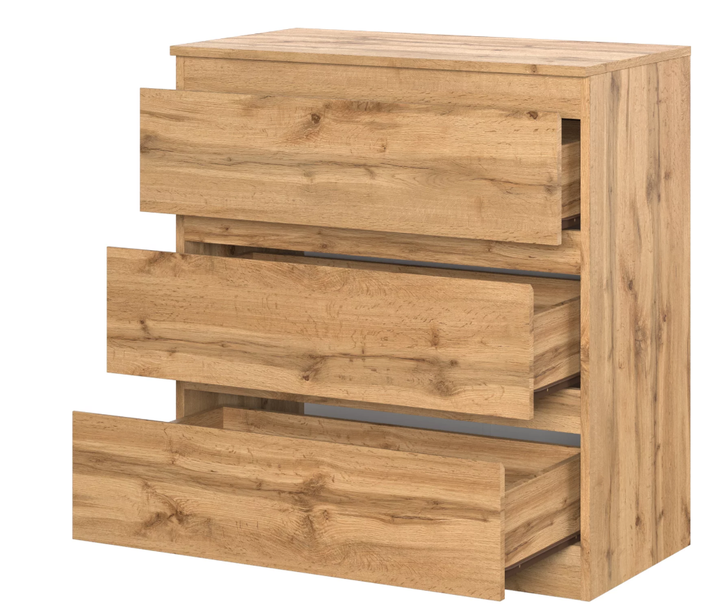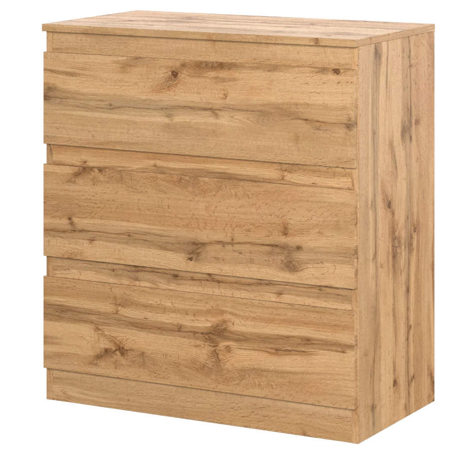 Лаконичный современный комод в древесном оттенке Дуб Вотан. Эффектный оттенок фасада и минималистичная элегантность сделают эту модель уместной и в классической, и в современной обстановке. Конструкция включает в себя три вместительных ящика на роликовых направляющих. Особенностью комода являются скошенные ручки на ящиках.