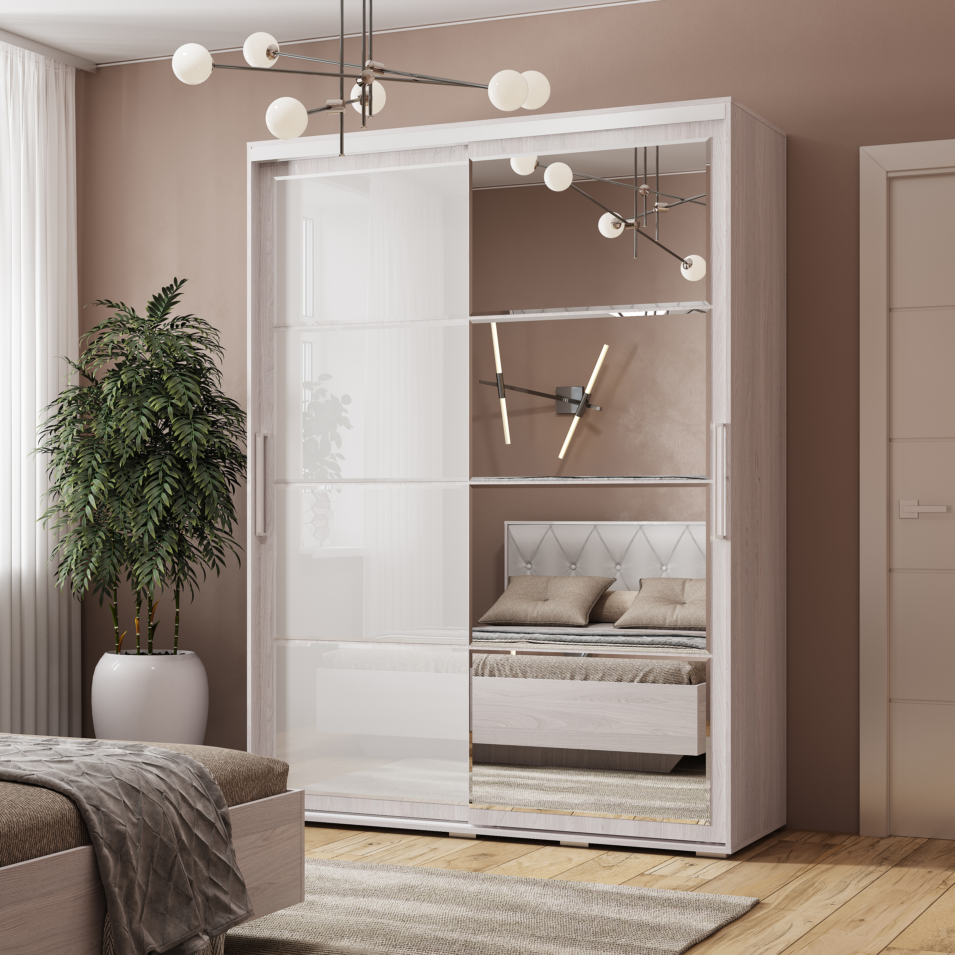 •  Визуальное расширение пространства: Левая створка с зеркалами во весь рост добавляет комнате объема, света и глубины.