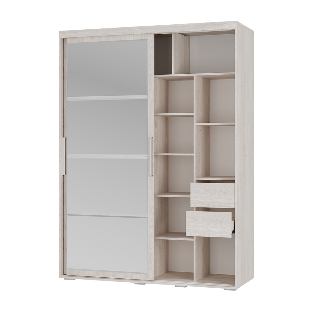•  Грамотное наполнение: Внутри предусмотрено всё необходимое — плательный отсек с хромированной штангой (772 мм), два выдвижных ящика, антресоль и вместительные полки.